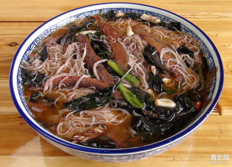 煮泥鳅时,先在锅中放入冷水,把洗净的泥鳅倒入锅中,让它在冷水中游动,然后文火烧锅,使泥鳅在游动的状态下被煮熟,这样煮出来的泥鳅又软又滑。泥鳅煮熟后,在泥鳅汤中加入烫过的上好粉干和生姜、腌菜、红酒等调料,即可食用,正宗的南霞泥鳅粉干,讲究嫩、香、软、滑、鲜,无怪乎其名声远扬了。泥鳅煮粉干,不仅可以一饱口服,也有食疗的作用。