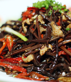 原料:蕨菜、胡萝卜、肉丝、泡发的海米、葱姜蒜末、黄酒、胡椒粉、盐。