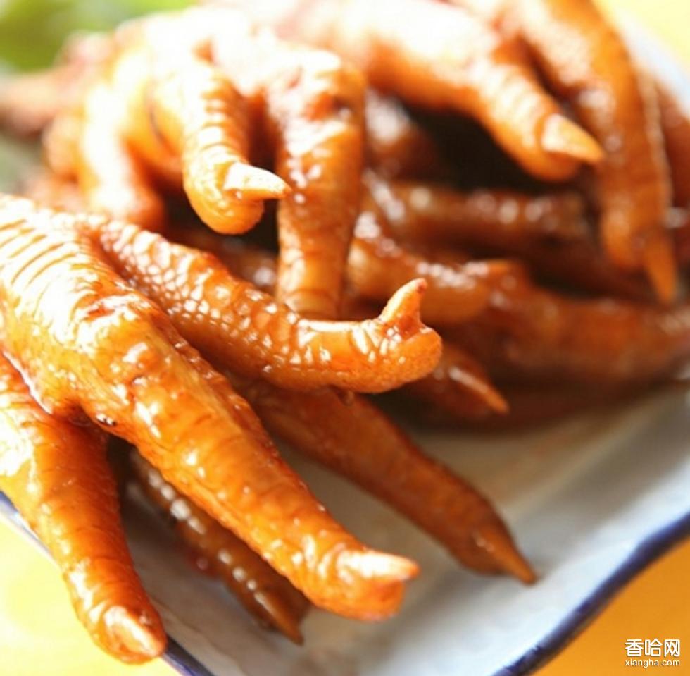 将鸡脚斩去爪尖,与鸡翅一齐放入沸水中烫一下,捞出洗净,放入锅中,加清水、绍酒烧沸后,移小火焖30分钟至熟,捞入冷开水中冷却,剔去脚骨、翅骨,然后理齐,切成段,整齐装盘,盘边放香菜,将酱油、香醋、白糖、味精一起放入碗中调匀,浇在脚、翅上,淋麻油即成。
