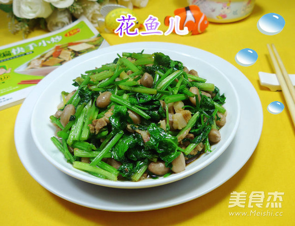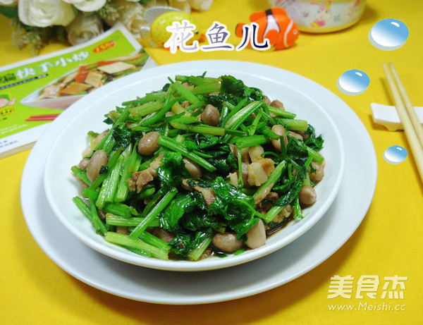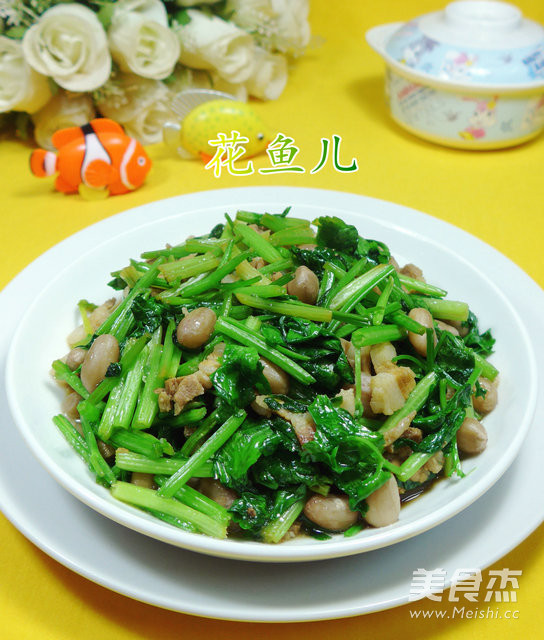 花鱼儿家的菜菜来了。。。 主料 芹菜150克 熟五花肉65克 花生70克 辅料 油3汤勺 生抽1汤勺 盐0.5勺 五花肉花生米炒芹菜的做法 1.食材:芹菜、熟五花肉(已切)、花生米(已煮熟) 2.将芹菜去根洗净 3.放在案板上切成段,待用 4.在锅中加入3汤勺油烧热,下入已切好的熟五花肉翻炒翻炒 5.接着,加1汤勺生抽 6.翻炒一下 7.然后,合入切好的芹菜和已煮熟的花生米翻炒翻炒 8.最后,加0.5勺盐 9.调味炒匀,即可