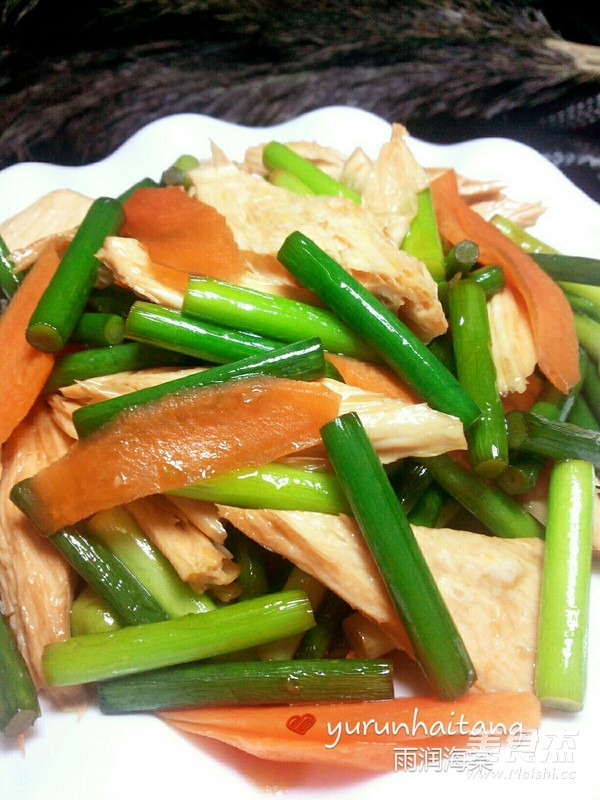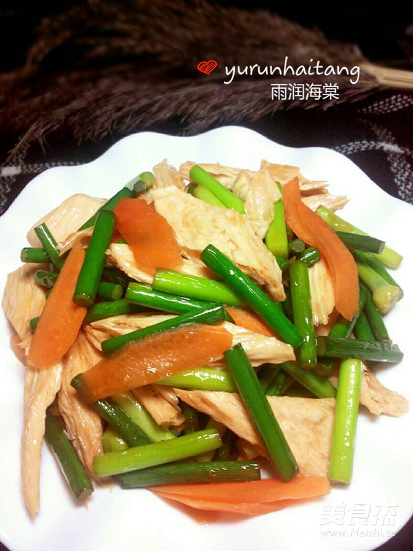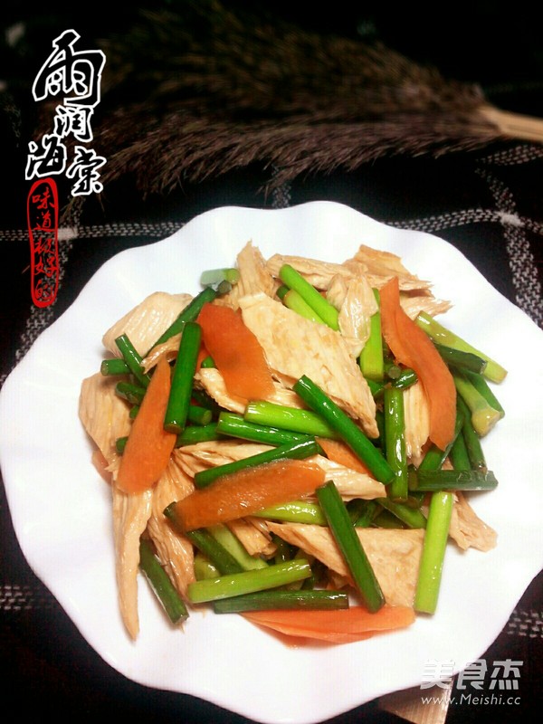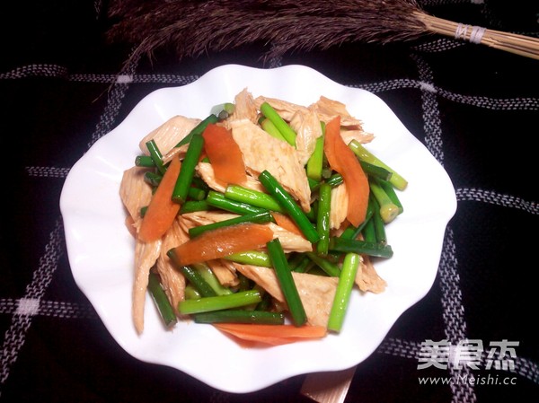 蒜苔是很好的功能保健蔬菜,不仅营养丰富,还有很好的药用保健价值呢!腐竹具有很高的营养价值,口味独特,对于人体的吸收是很有益处的,大家都喜欢吃。 主料 蒜苔150克 腐竹50克 辅料 胡萝卜20克 酱油10毫升 盐1克 花生油15毫升 蒜苔炒腐竹的做法 1.准备食材:腐竹提前泡发好 2.热锅放油,放入蒜苔翻炒几下 3.放入酱油 4.放入腐竹翻炒几下 5.放入胡萝卜翻炒几下 6.放入少许盐炒匀即可 7.色泽鲜艳营养丰富 烹饪技巧 旺火快炒,腐竹用温水泡发