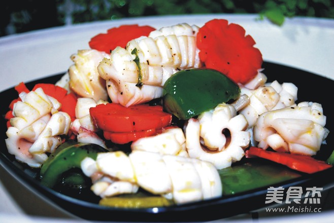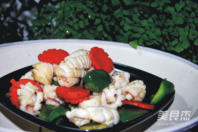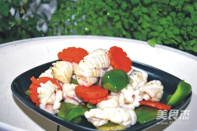 4.加入鱿鱼卷爆炒2分种,加入料酒,生抽和沿锅边溜点水,出锅前加少许的鸡粉和现磨黑胡椒粉就ok了