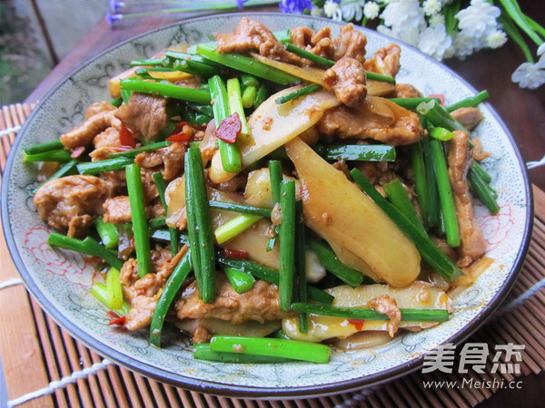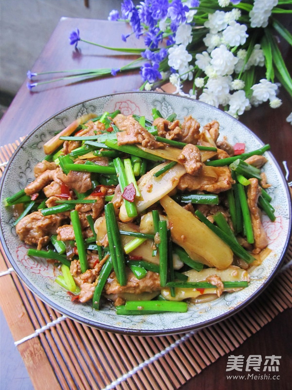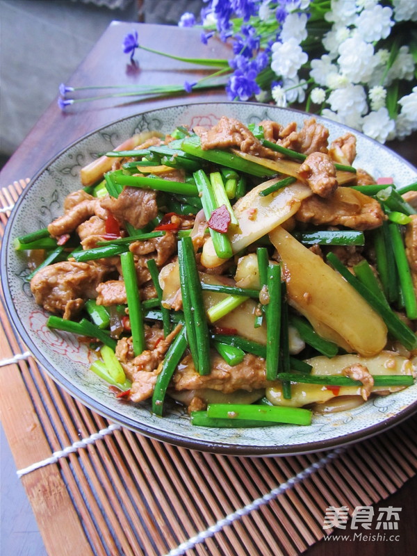 韭菜苔质地脆嫩,清香怡人。非常好吃。 主料 韭菜苔300克 猪肉250克 子姜25克 辅料 食用油适量 水淀粉1茶匙 豆瓣酱1汤匙 酱油2茶匙 食盐适量 味精适量 韭菜苔炒肉的做法 1.准备食材:韭菜苔、子姜、猪肉(切片,瘦肉放少水许淀粉抓匀) 2.韭菜苔去头,切段。子姜切片 3.锅中油烧热,放入肥肉煸炒出油脂。放入瘦肉炒至变白 4.放入豆瓣酱和酱油炒匀,倒入子姜 5.放入韭菜苔,大火快炒至断生。放入少许食盐、味精调味即可