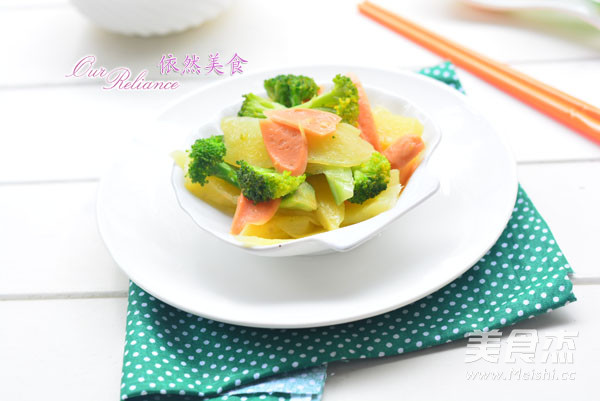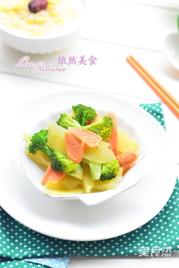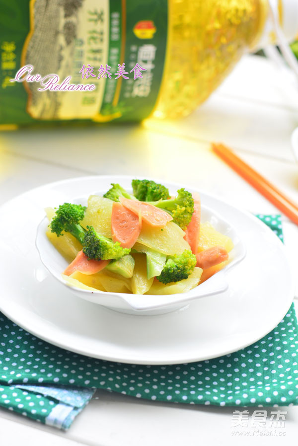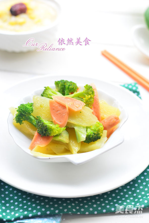 1.土豆300克 西兰花200克 火腿肠2根 恒大兴安芥花籽橄榄油一汤匙 白米醋数滴 食盐2克 味精1克