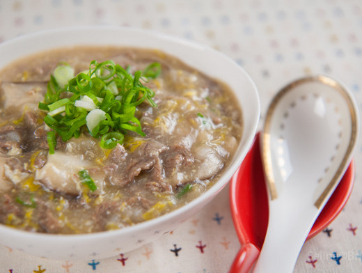 今天这道蔬菜牛肉粥的制作方法是先用电锅将米煮成粥,再用锅子煮成绵密的粥,一点也看不出米粒的样子,白白净净的粥看起来好不漂亮,且入口即化。但是,光只有白粥又担心不够营养,于是加了牛肉与蔬菜,也多了肉香与蔬菜的甜味,让身体不适的老爷也能吃得美味。煮得绵密的牛肉粥看起来或许不是很漂亮,但是却很得老爷的心与胃喔!边吃边说:“怎么这么好吃啊!”