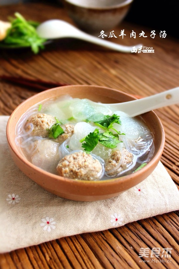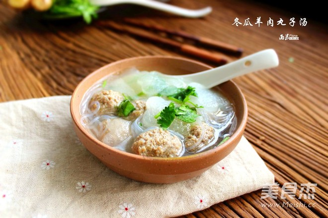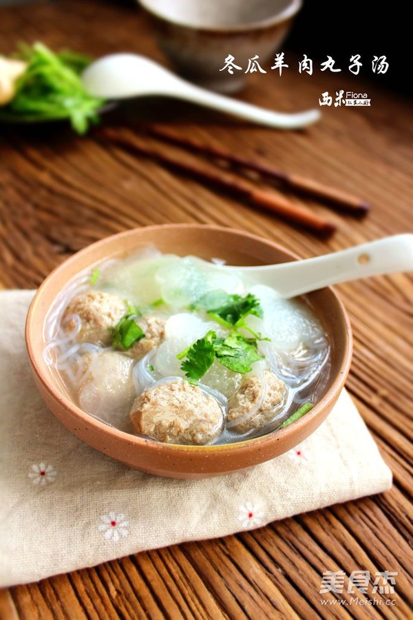 6.羊肉丸子煮熟捞出。另起一锅热水,下入一半丸子(另一半可以冻冰箱下次用),几分钟后,加入冬瓜片,煮熟后把粉丝放进去。调入适量盐,鸡精,胡椒粉。