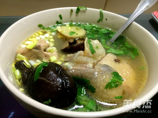 7.一直到沸腾的水完全是白色的,放入发好的香菇,汤再次沸腾后关小火,盖上锅盖慢慢炖1-2小时,最少也要炖1个半小时。