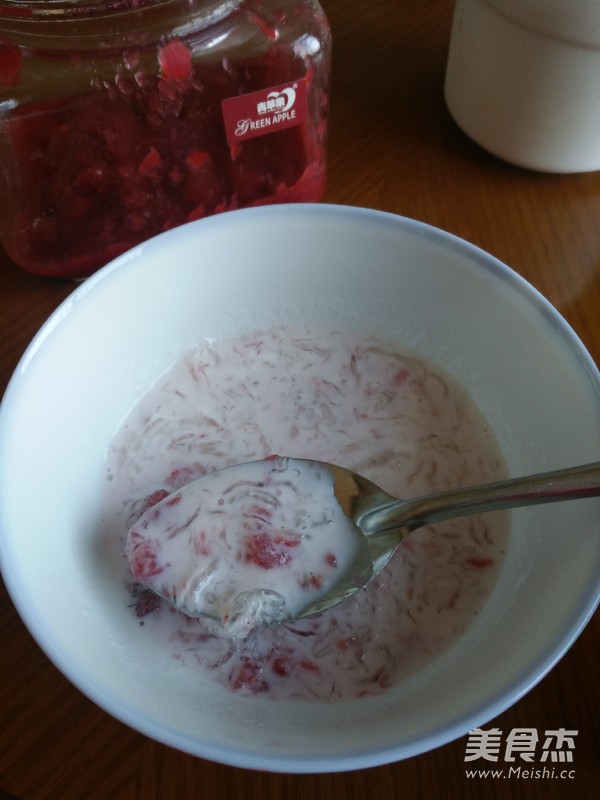 3.调和:鲜奶温热加入燕窝稍煮2-3秒关火再加上自制的草莓酱就可以享受美味了。当然牛奶加热后也可以直接关火然后加入燕窝跟草莓酱,味道一样杠杠的哦。