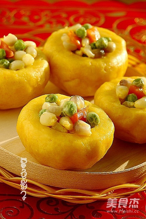 9.葱花爆锅、放玉米粒、豌豆、翻炒过程中加盐和点点的水、盖锅几分钟、放柿子翻炒一下停火、装窝头即可