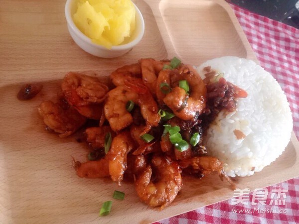 6.用小碗盛米饭,压实,倒扣在盘中。 将虾仁倒入盘中摆盘。
