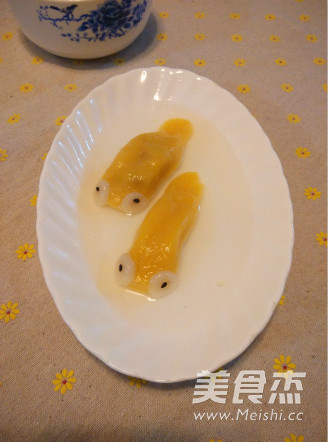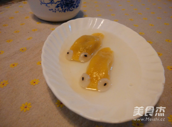 9.黑芝麻用水粘在白球上作眼珠,再小鱼尾巴上压几条纹路,放置十分钟定形