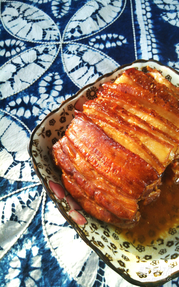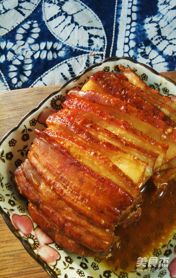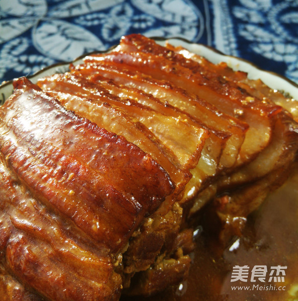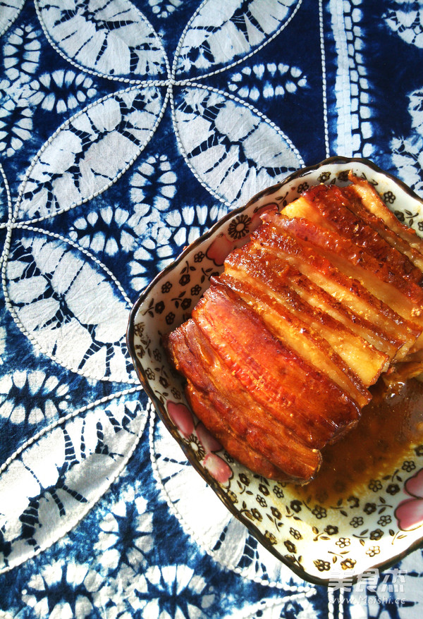 12.将汤汁倒在另外一锅里,用另一个盘子扣在上面,翻转方向,肉就扣进盘里了,此时肉皮朝上。为了让每片肉都入味,我把粘在一起的肉片稍稍分开了一点儿,方便酱汁倒进去