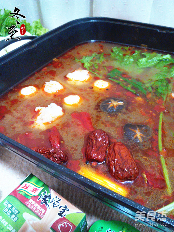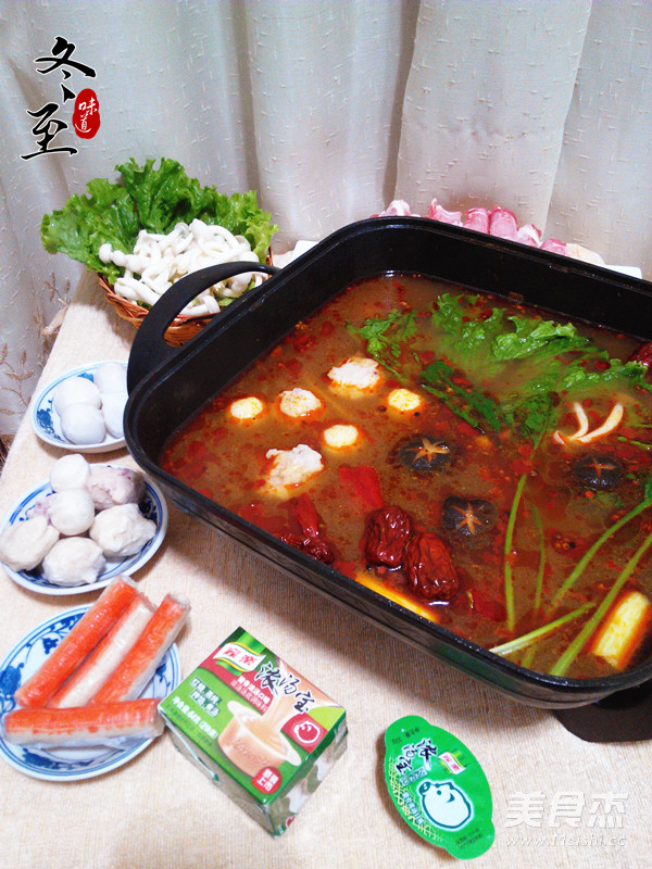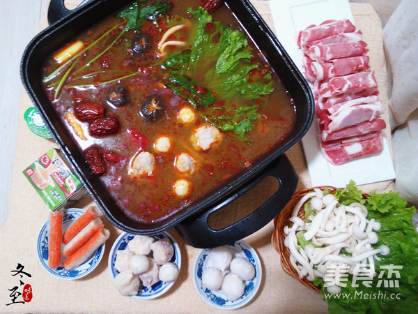大冷天的,吃一回热乎乎的麻辣火锅,很是过瘾。 主料 羊肉片适量 生菜适量 鱼丸适量 蘑菇适量 香菇适量 菠菜适量 辅料 植物油2汤匙 花椒5克 郫县豆瓣酱2汤匙 葱3段 姜3片 蒜2瓣 冰糖1/2汤匙 干辣椒2个 大枣4个 家乐猪骨浓汤宝2盒 麻辣火锅的做法 1.锅底料备齐 2.锅加油烧热,下入郫县豆瓣,干辣椒小火炒至出红油 3.加入水至锅的2/3处,下入葱姜蒜,冰糖,花椒,大枣 4.在下入家乐猪骨味浓汤宝2盒 5.大火烧开,改中小火熬约十分钟即成火锅底 6.吃时将锅与配菜一同上桌 烹饪技巧 也可以再加一些郫县豆瓣和花椒