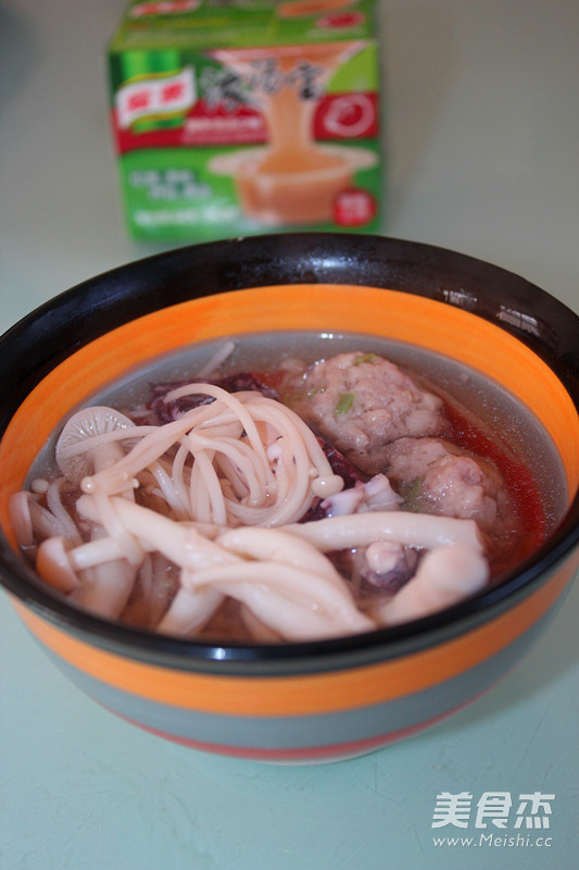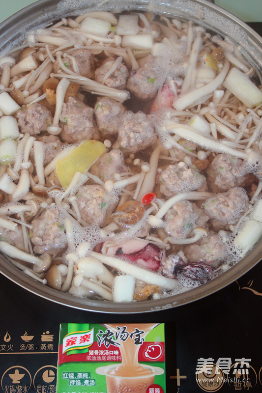 大冷天,一家人围坐一桌,吃一顿热气腾腾的火锅,其乐融融,今天用家乐浓汤宝代替猪骨汤做的菌菇肉丸火锅,非常的棒! 主料 金针菇100克 白玉菇100克 蟹味菇100克 海鲜菇100克 肉馅200克 辅料 浓汤宝1块 #家乐浓汤宝#清汤菌菇火锅的做法 1.备料,所有的蘑菇摘根洗净 2.肉糜加入生抽、花生油、葱姜末、鸡精、盐、少许淀粉搅拌上劲,备用 3.锅里放大半锅水,放入海米,葱段,姜片,再放入一块浓汤宝打底,烧开 4.然后再放入所有的菌菇,肉糜团成肉丸放入锅里 5.肉丸煮熟可以吃了