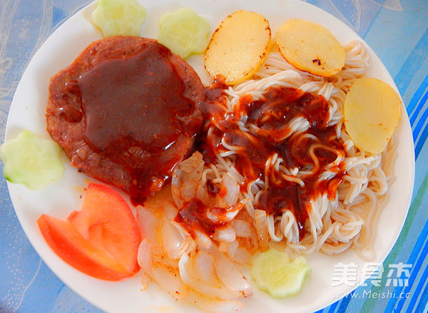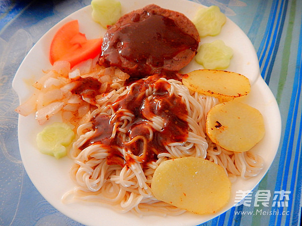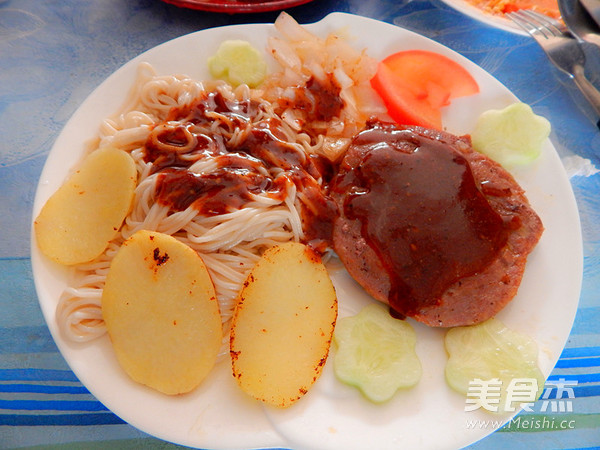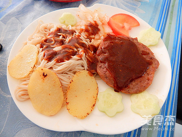 周末终于买来牛排了,准定试试煎牛排给孩子吃 主料 牛排3块 土豆1个 面条2碗 洋葱50克 辅料 黄油30克 黑椒酱100克 黑椒牛排的做法 1.牛排,提前腌一个晚上 2.然后平底锅预热,牛排放上煎20秒 3.翻面煎20秒 4.装起来后锅里倒入黄油 5.把煎过的牛排放入煎 6.两面各煎5-6分钟 7.土豆片煎金黄 8.煎 好的牛排 9.洋葱炒一会 10.黑椒牛排粉 11.倒入碗里 12.加入水 13.煎好的牛排摆上面条还有土豆 14.开始熬酱 15.熬至自己想要的浓度后泼在牛排及面上 烹饪技巧 吃的时候搅拌均匀 煎牛排的熟度按自己喜欢好