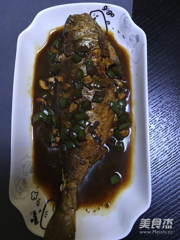 8.锅里还有少量汤汁时,将鱼捞出摆盘。用漏勺将汤之内的调料捞出,再将青椒丁和蘑菇丁放入锅内,继续收汁。