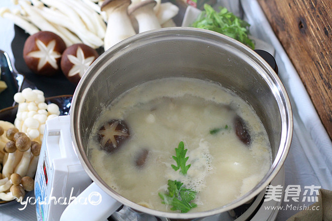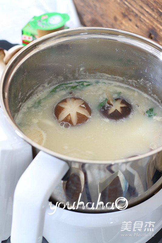 6.开锅后就可以放入菌类和青菜,边煮边吃,配少许的火锅调料