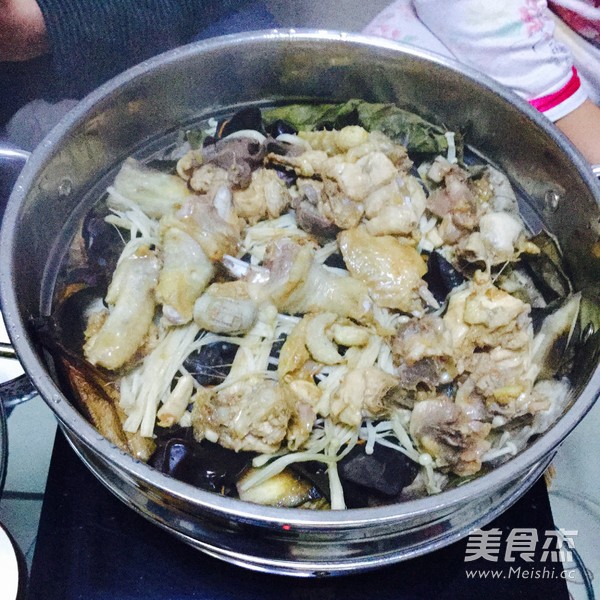 12.揭开锅盖,将鸡肉和配菜拌匀就可以享用了,鸡肉原汁原味,非常美味,配菜吸收了鸡的鲜美也变得鲜美了,边吃边加入自己喜欢的菜或肉都可以的,反正就跟吃火锅差不多