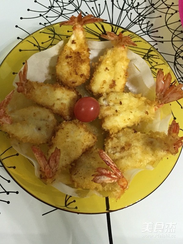6.油7分热,将虾放入油中小火炸 面包屑成金黄色即可