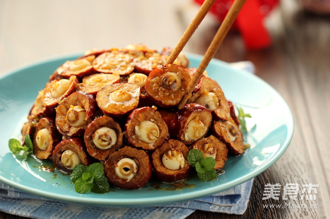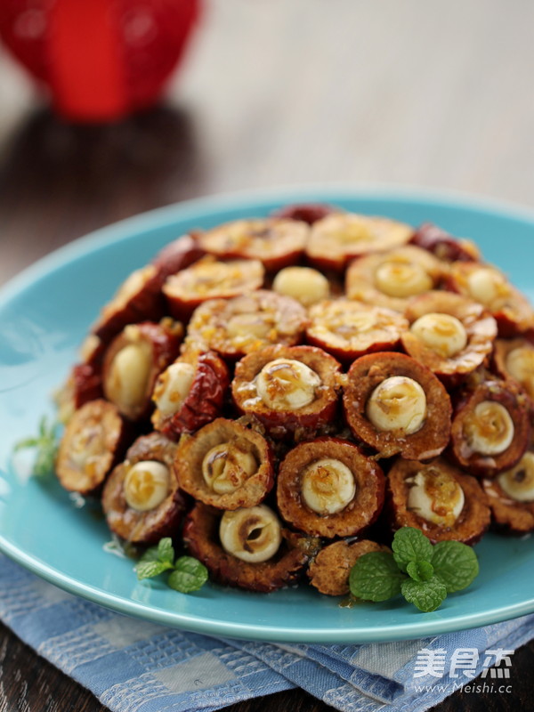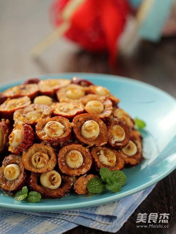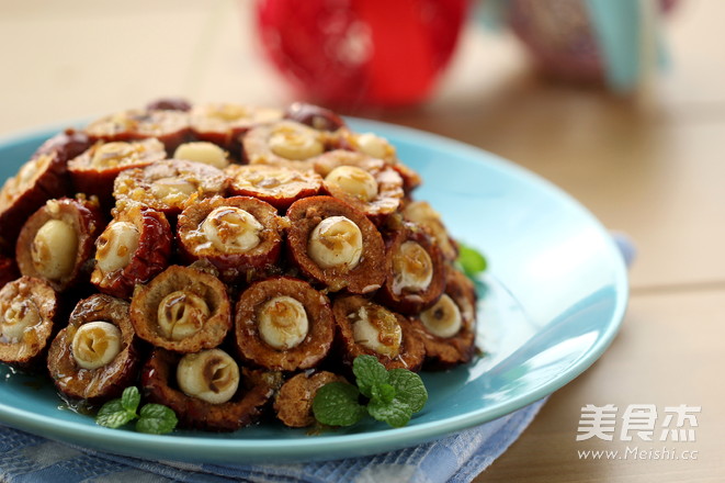 5.将煮好的莲米放入红枣中间;