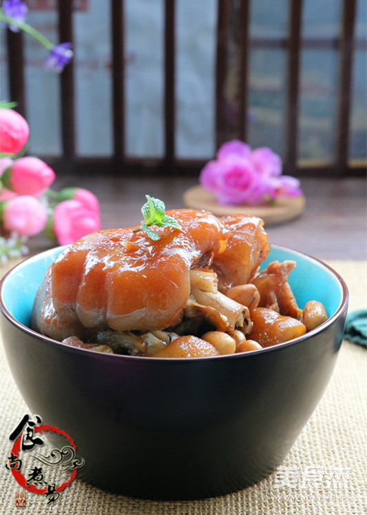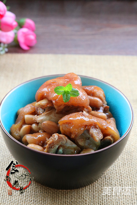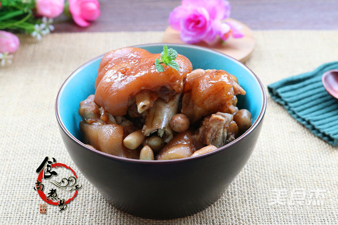 猪手洗净后要焯水去除异味和油脂,用电饭锅焖煮时不需太长时间,焖煮的时间长了影响外形和口感,用快煮饭键刚刚好,吃起来口感绵软带有一点Q弹。花生米提前10分钟浸泡、与猪手同步熟透软绵。加入少许陈皮可以帮助增香,吃起来不油腻。