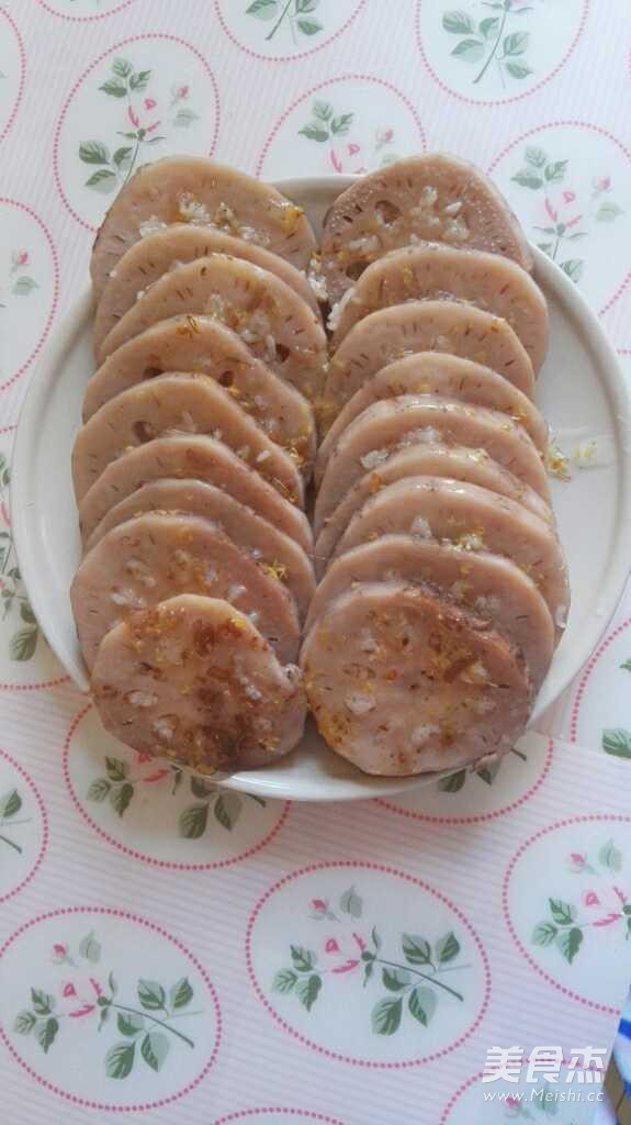 做出来,吃饭的时候有点小激动,以前只能去外面餐厅吃,现在自己也做的出来啦,便宜实惠好吃。 主料 莲藕1节 糯米20克 辅料 冰糖80克 红糖40克 桂花糖适量 桂花糖糯米莲藕的做法 1.把藕洗净削皮 2.泡糯米半小时以上,让糯米充分吸水,这样容易煮熟煮透。 3.在藕的顶端2~3厘米的地方切开 4.在藕的洞洞填上糯米,填满它,可以用筷子捅,比较好填。 5.把盖子盖好,插上牙签固定 6.在锅里装上红糖冰糖,用水化开,把藕放进锅里,装盖过藕的水,然后煮2小时以上~最后捞出来切片装盘。然后淋上一点锅里剩的汁和桂花糖,喜欢也可以再淋点蜂蜜!待冷却后更好~ 烹饪技巧 固定藕的牙签要固定好,免得煮的过程中松掉。糖根据自己的口味加减~