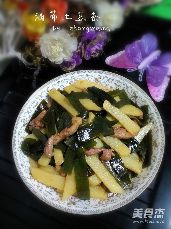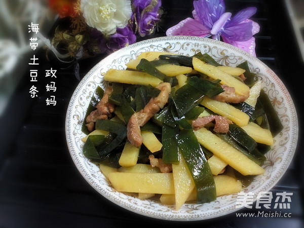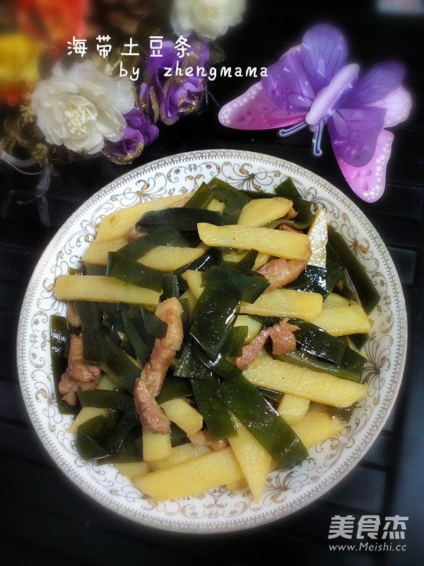 新鲜的海带又上市了,这个时候的海带味道鲜美,营养丰富,用来凉拌或炒味道都很不错。 主料 猪肉150克 土豆2个 海带200克 辅料 油2勺 盐适量 味极鲜酱油1勺 海带土豆条的做法 1.猪肉切条。 2.海带洗净切条。 3.土豆去皮洗净切条。 4.热锅凉油加入猪肉煸炒。 5.加入土豆翻炒。 6.加入海带翻炒。 7.加入味极鲜酱油翻炒均匀。 8.加入适量水炖煮。 9.煮至汤汁浓稠加入盐调匀即可。 烹饪技巧 可以加入海鲜同煮味道更鲜美。
