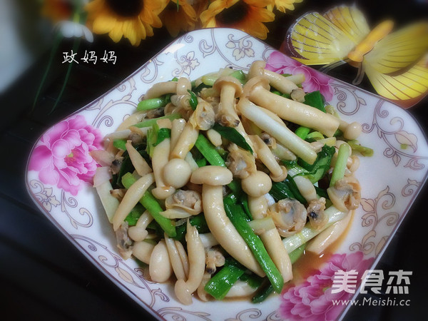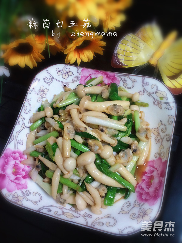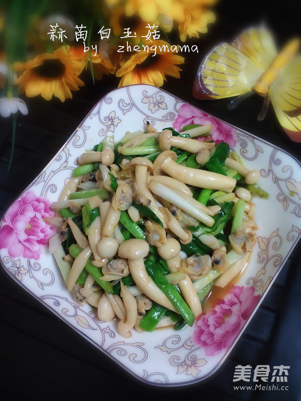 家常菜---蒜苗白玉菇,加入了蛤蜊肉,味道很鲜美。 主料 白玉菇1盒 蒜苗3棵 蛤蜊肉150克 辅料 油2勺 盐适量 蒜苗白玉菇的做法 1.白玉菇剪掉根部洗净。 2.蒜苗摘洗干净切段。 3.准备蛤蜊肉。 4.锅里油热加入葱花炒香。 5.加入白玉菇翻炒。 6.加入蒜苗翻炒。 7.加入酱油翻炒。 8.加入蛤蜊肉翻炒均匀。 9.炒至白玉菇断生加入盐调匀即可。 烹饪技巧 白玉菇也可以先焯水再炒。蛤蜊肉有咸度,少加一点盐。