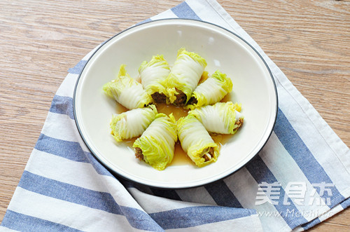 3.将娃娃菜煮软,沥干水分,摆在碟子上,菜叶上铺一层肉泥,在靠近娃娃菜根部的一端卷起来,成卷儿