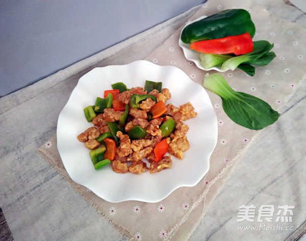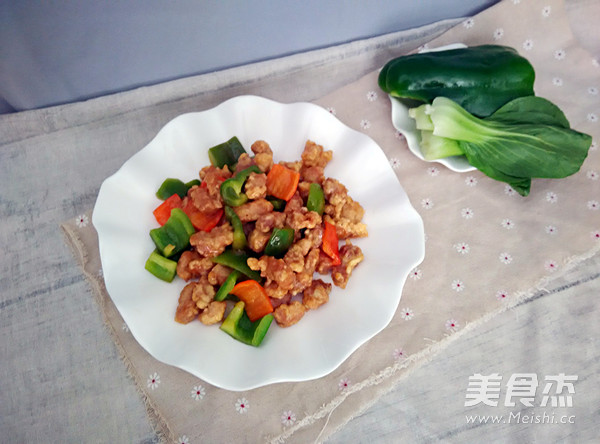 8.调好的酱倒入干净的锅里烧热加入半碗水加5克玉米淀粉勾芡,放入青椒、红椒收水至浓稠