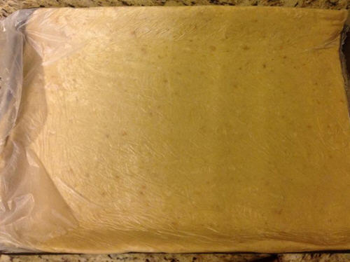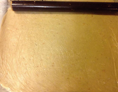 21、用杆面棍杆平,厚度约0.5cm左右整齐,冰在冰箱冷冻约30-40分钟。