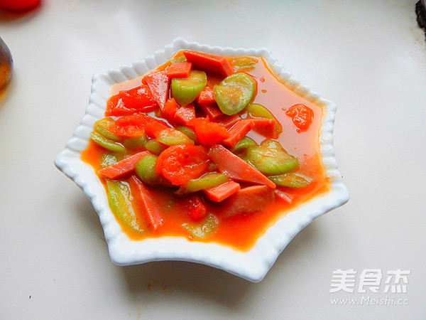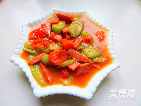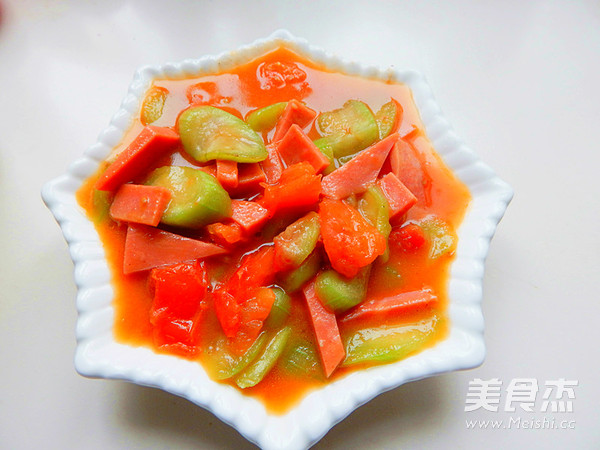 就余一点菜了就配配菜吧。 主料 西红柿2个 丝瓜1根 火腿50克 辅料 盐4克 鸡精3克 水适量 植物油15克 西红柿炒丝瓜的做法 1.材料准备好 2.锅里加入油加入西红柿炒出汁 3.然后加入丝瓜炒 4.快速炒匀 5.然后加入一点水炖五分钟 6.然后加入火腿片 7.炒匀后加入盐 8.不停的翻炒 9.然后加入鸡精炒匀 10.炒好装盘 烹饪技巧 炒菜的时候可以多加点水,煮到最后流汤浇在饭上也好吃。