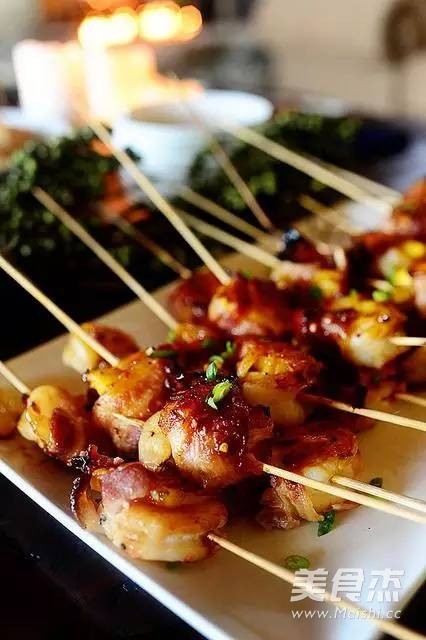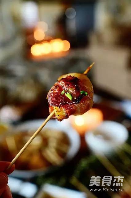 5.用培根裹住,再用木串从下往上串起来;
