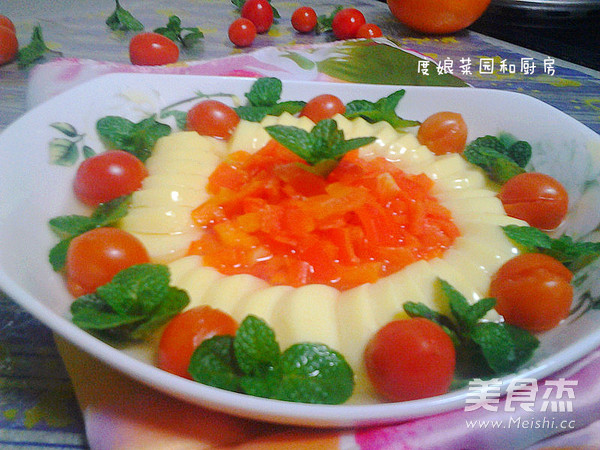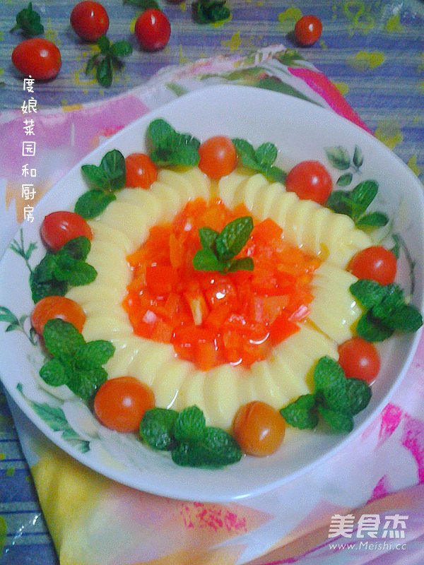 玉子豆腐又称鸡蛋豆腐,实际上并不是真正的豆腐,而是一种鸡蛋制品。玉子豆腐的做法五花八门,可以红烧、油煎等。玉子豆腐本身就比较鲜嫩,今天将玉子豆腐清蒸烹饪,味道更加鲜嫩爽滑。搭配圣女果、红辣椒、薄荷,营养更加全面。因为家里的小公主比较挑食,所以要变着花样做菜才能引起小公主的食欲哦!所以今天的鱼子豆腐搭配颜色靓丽的圣女果和薄荷,色香味俱全,小公主美滋滋地吃了不少呢!家有小宝贝的亲们也可以试试这种做法哦!