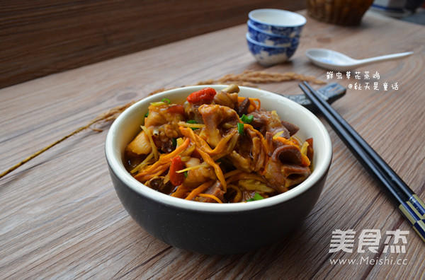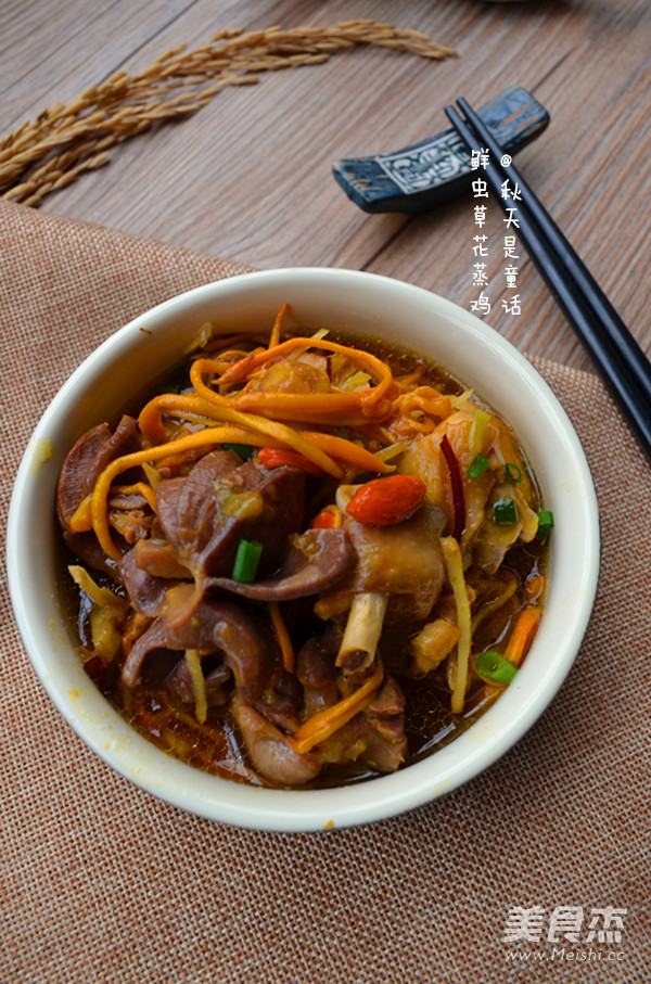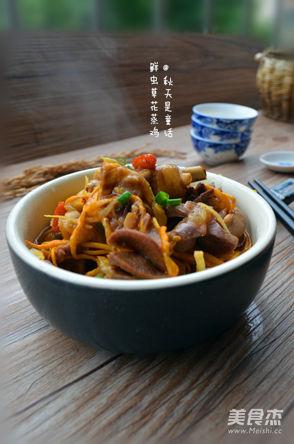 4.鲜虫草花洗净,一半铺蒸盘底,一半和鸡块拌匀