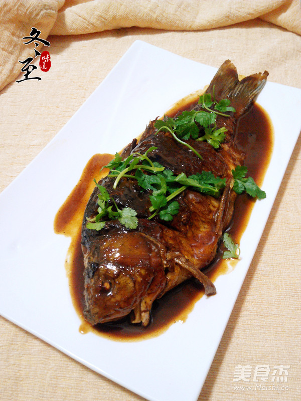 7.至剩少许汤汁时将鲫鱼盛在盘内