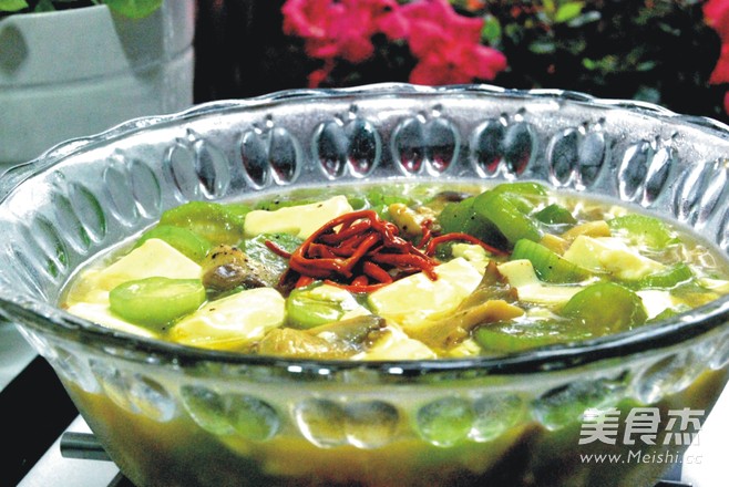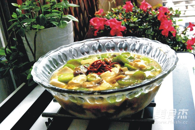 由于豆腐嫩,先勾薄芡豆腐不易碎动作要轻,使豆腐块仍保持完整。