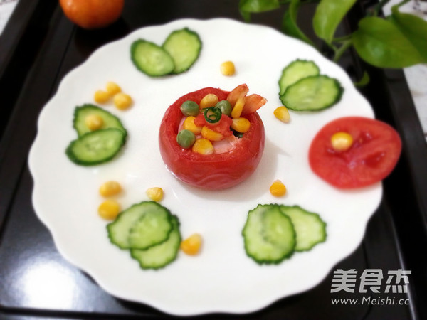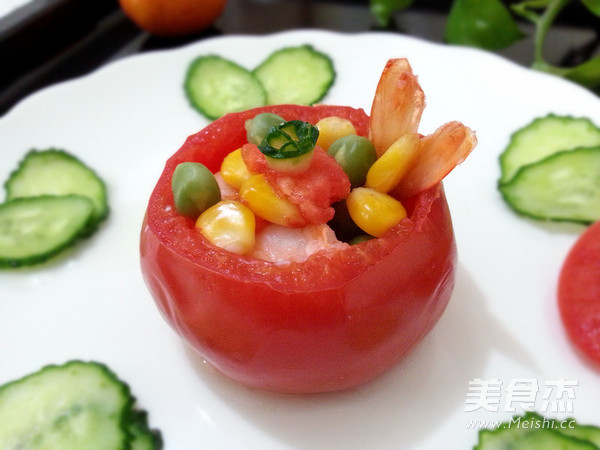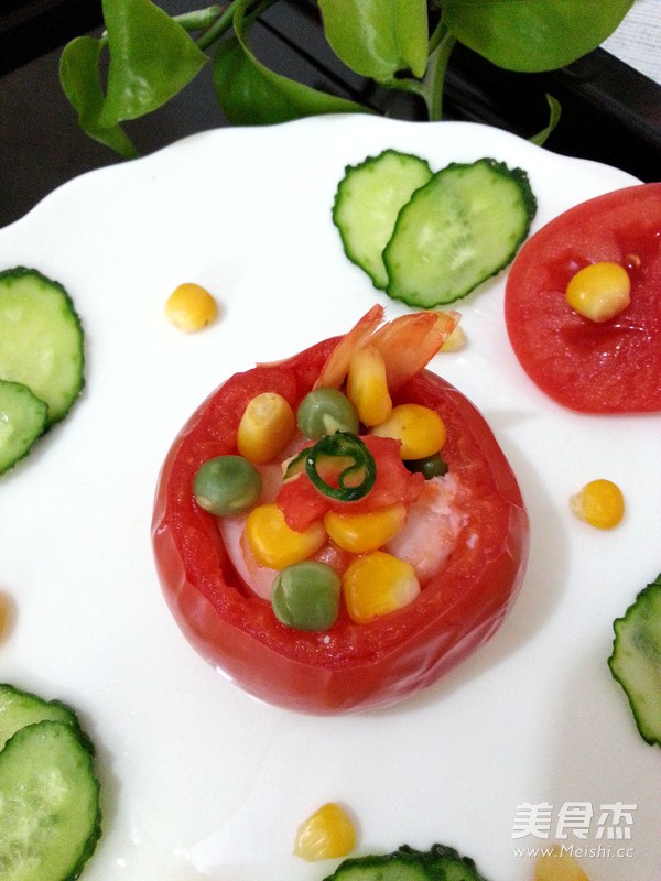 西红柿盅不要装得太满,经过加热,西红柿肉是要膨胀的,装得太满,会撑破皮的。先腌制虾,让虾有底味,虾才会吃着有味道。