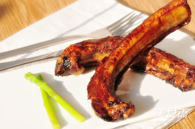 4.在烤盘上铺上锡箔纸,将排骨放在锡箔纸上,用上下火230度烤制20分钟,10分钟后在排骨表面刷上蜜糖即可