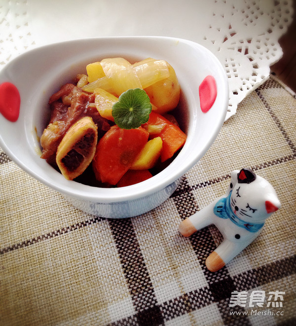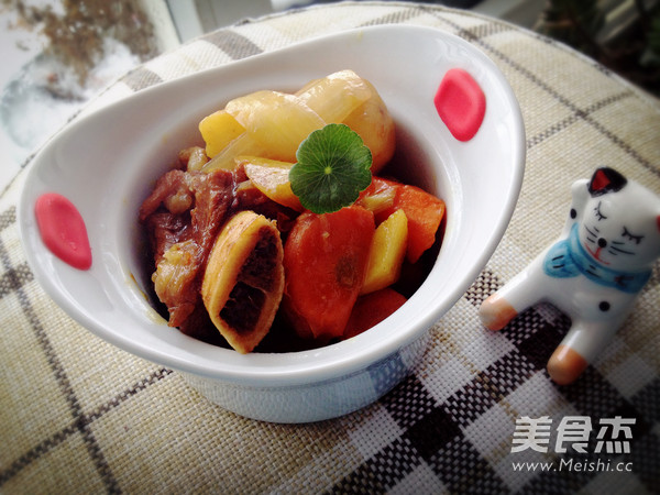 5.放入炖好的牛排骨一起炖,小火十分钟即可。菜不用放盐,咖哩块有味道,老抽也有咸味儿。