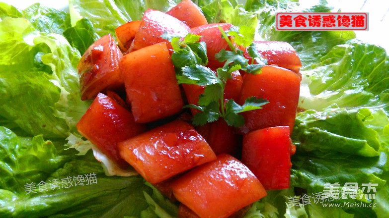 13.用生菜铺盘,用筷子将蒸好的肉夹出,肉皮朝上,码入盘中,大功告成