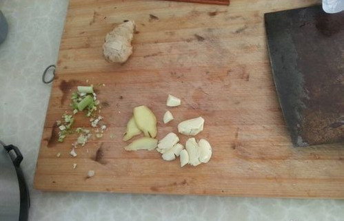 4、放入老姜,转小火,爆香至姜片的两面均“皱”起来,呈褐色,但不焦黑;