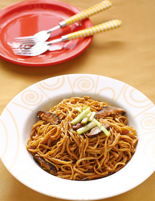 3、热一油锅,倒入沙拉油烧热,放入水、所有调味料、大地鱼粉、作法2的香菇丝及作法1伊面条一起拌炒均匀后,改转中火煮至汤汁收干。