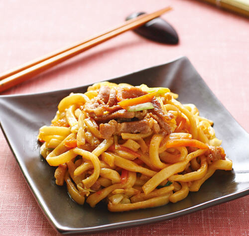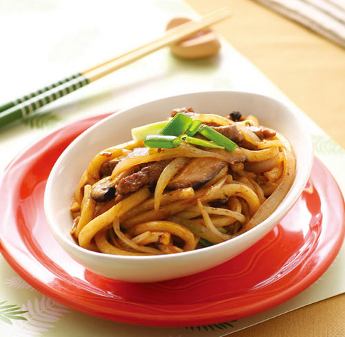 2、热一油锅,倒入沙拉油烧热,放入洋葱丝、香菇丝以小火炒香,加入乌龙面条后以中火快炒约2分钟。