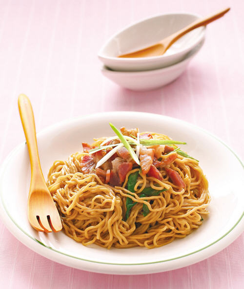广东生面 150公克、叉烧肉 30公克、姜丝 10公克、葱丝 15公克、沙拉油 1大匙、水 150cc