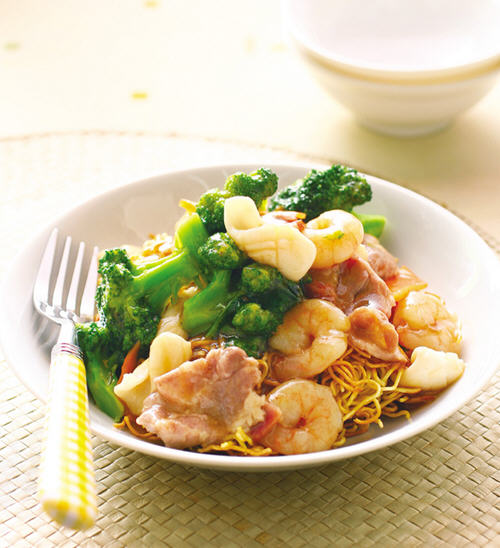 广东鸡蛋面 150公克、虾仁 4只、叉烧肉片 4片、透抽 4片、猪肉片 4片、青花椰菜 5朵、红萝卜片 4片、水 250cc、沙拉油 3大匙
