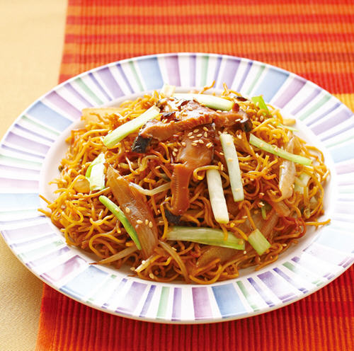4、于作法3锅内放入面条、所有调味料和水,一起拌炒至汤汁收干即可。