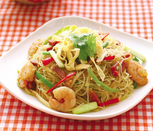 新竹米粉 1/2包、洋葱 1/4颗、虾仁 5只、叉烧肉 50公克、青椒 15公克、红甜椒 1条、绿豆芽 20公克、水 100cc、沙拉油 2大匙