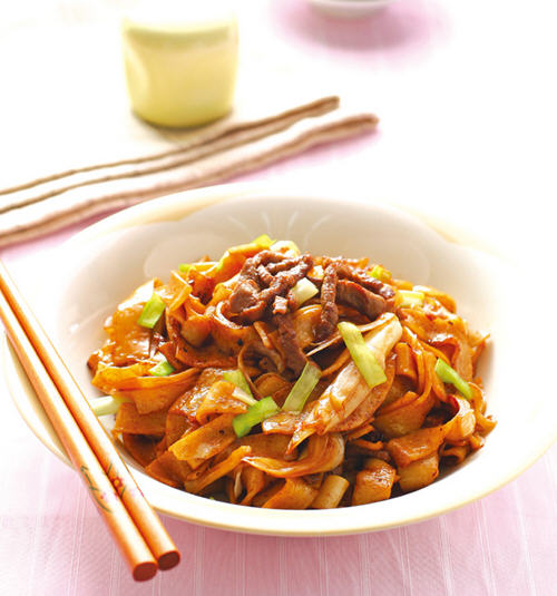 河粉 200公克、牛肉丝 80公克、韭黄 20公克、葱 1支、绿豆芽 30公克