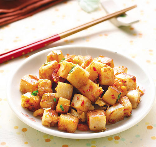 3、热一油锅,倒入沙拉油烧热,放入作法1的萝卜糕丁以小火慢煎热后,加入蒜末、虾米和萝卜干,改转中火一起快炒至香。